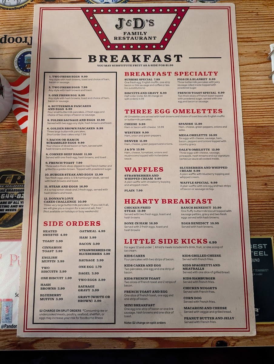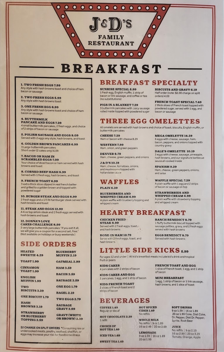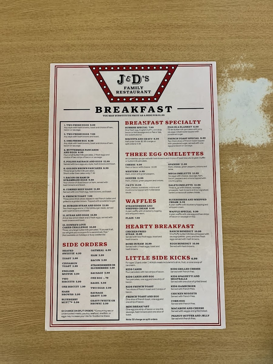 J & D’s offers a straightforward, comforting menu that feels right at home in a family-friendly setting. The selection focuses on classic breakfast and simple lunch options, perfect for starting the day or enjoying a relaxed meal any time. Whether it’s morning or evening, you’ll find familiar plates like eggs served any style with hashbrowns and toast, hearty buttermilk pancakes paired with bacon or sausage, and well-prepared steaks for those seeking a more substantial bite.